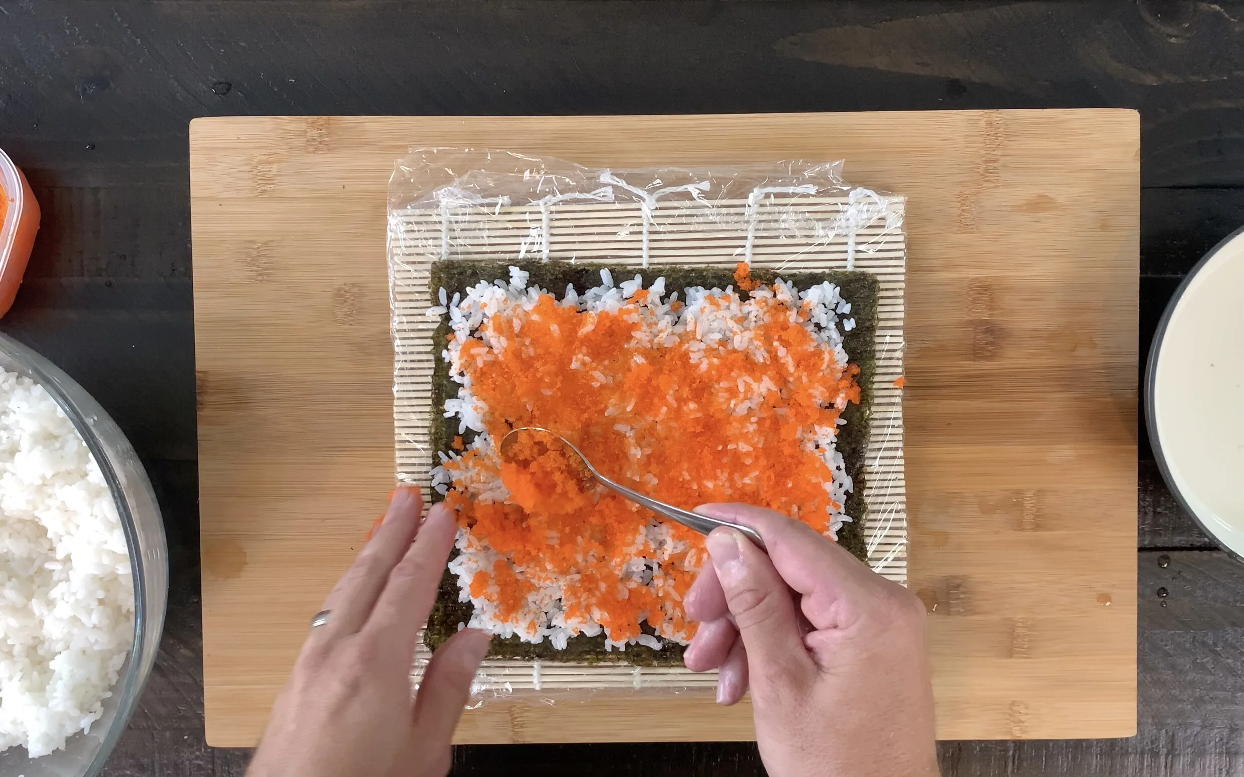 4. Add tobiko or masago: After the rice is pressed onto the nori sheet, add a thin layer of tobiko or masago to the top of the rice. Then flip the sheet over.