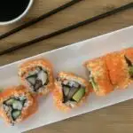 They also have a signature bright orange or red color on the outside due to the a fish egg garnish called tobiko or masago. This also gives the roll a salty taste and a crunchy texture.