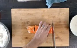 7. Cut the roll: Using a sharp knife, cut the roll into 8 pieces. I do this by first cutting the roll in half. Then cutting each half in half. Then cutting each fourth in half. Tip: Be sure to clean and wet the edge of your knife before cutting each roll.