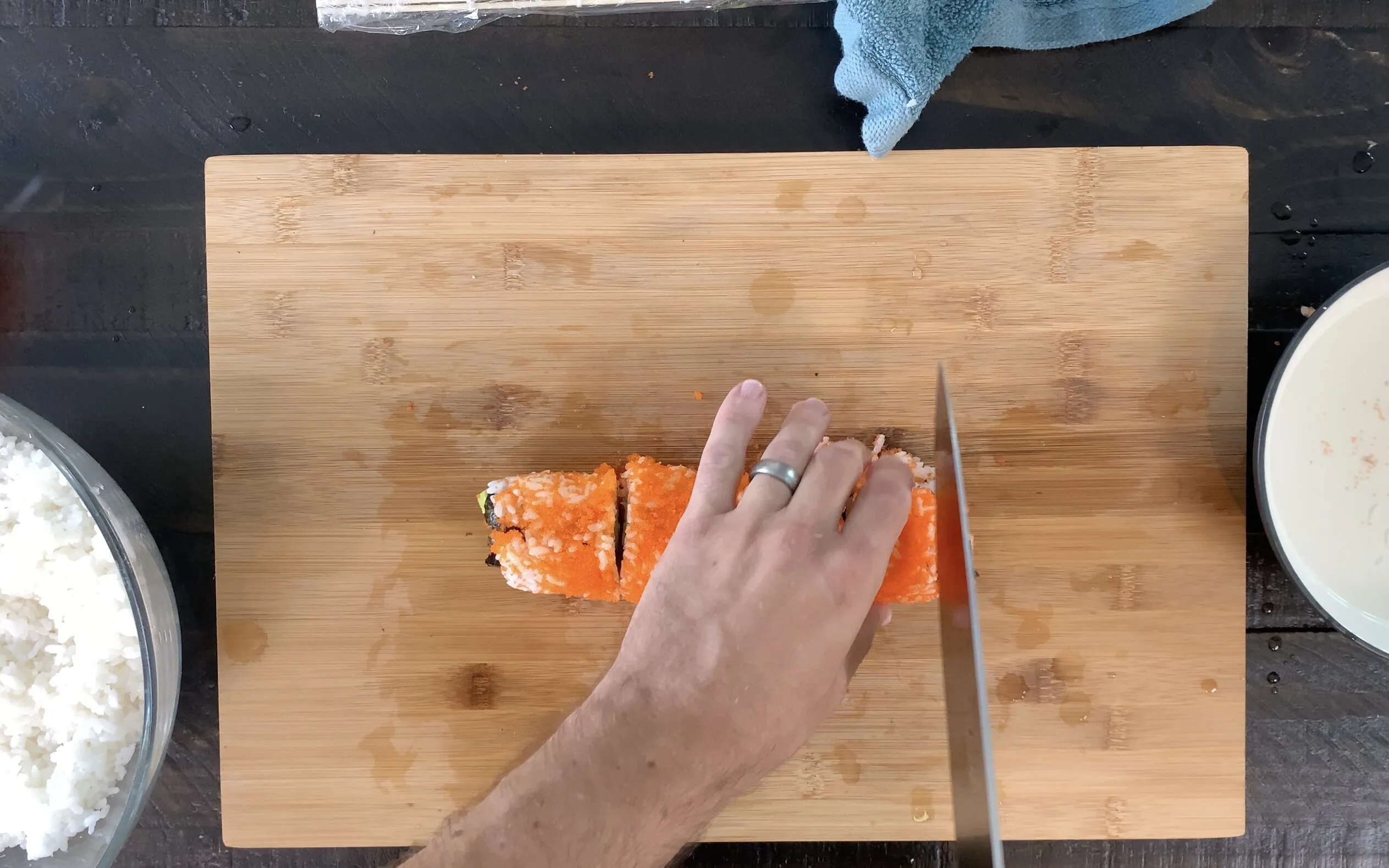 Tip: Wet your hands with a bowl of water mixed with a splash of rice vinegar before working with sushi rice as it helps prevent the rice from sticking to your hands.