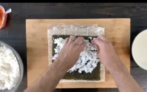 • Add tobiko or masago: After the rice is pressed onto the nori sheet, add a thin layer of tobiko or masago to the top of the rice. Then flip the sheet over so the rice is facing down.