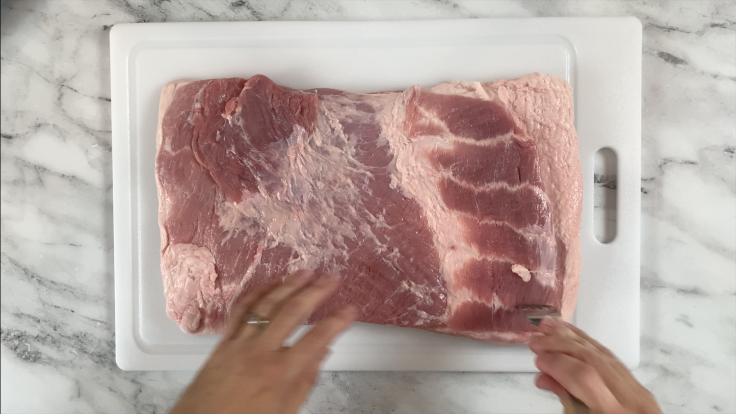 1. Examine your pork belly to make sure it has roughly the same thickness throughout and will roll evenly. Shave thicker parts if necessary.