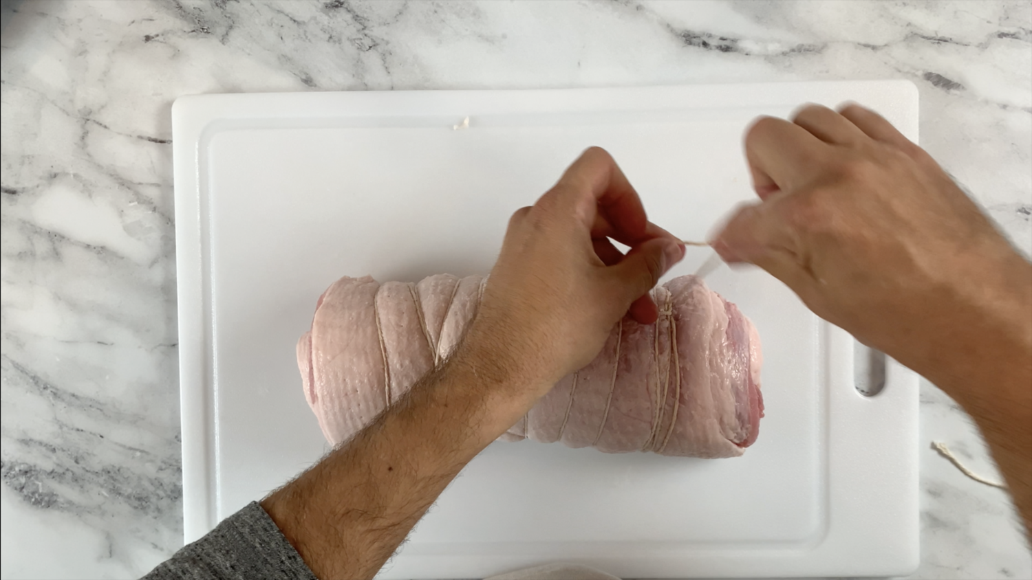 - Roll the pork belly tightly starting at the shortest side and tie with butchers twine. There are several different ways to do this but the important thing is to make sure the belly remains tightly wrapped during cooking.