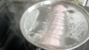 5. Once boiling, remove pork from pot and rinse off with water.