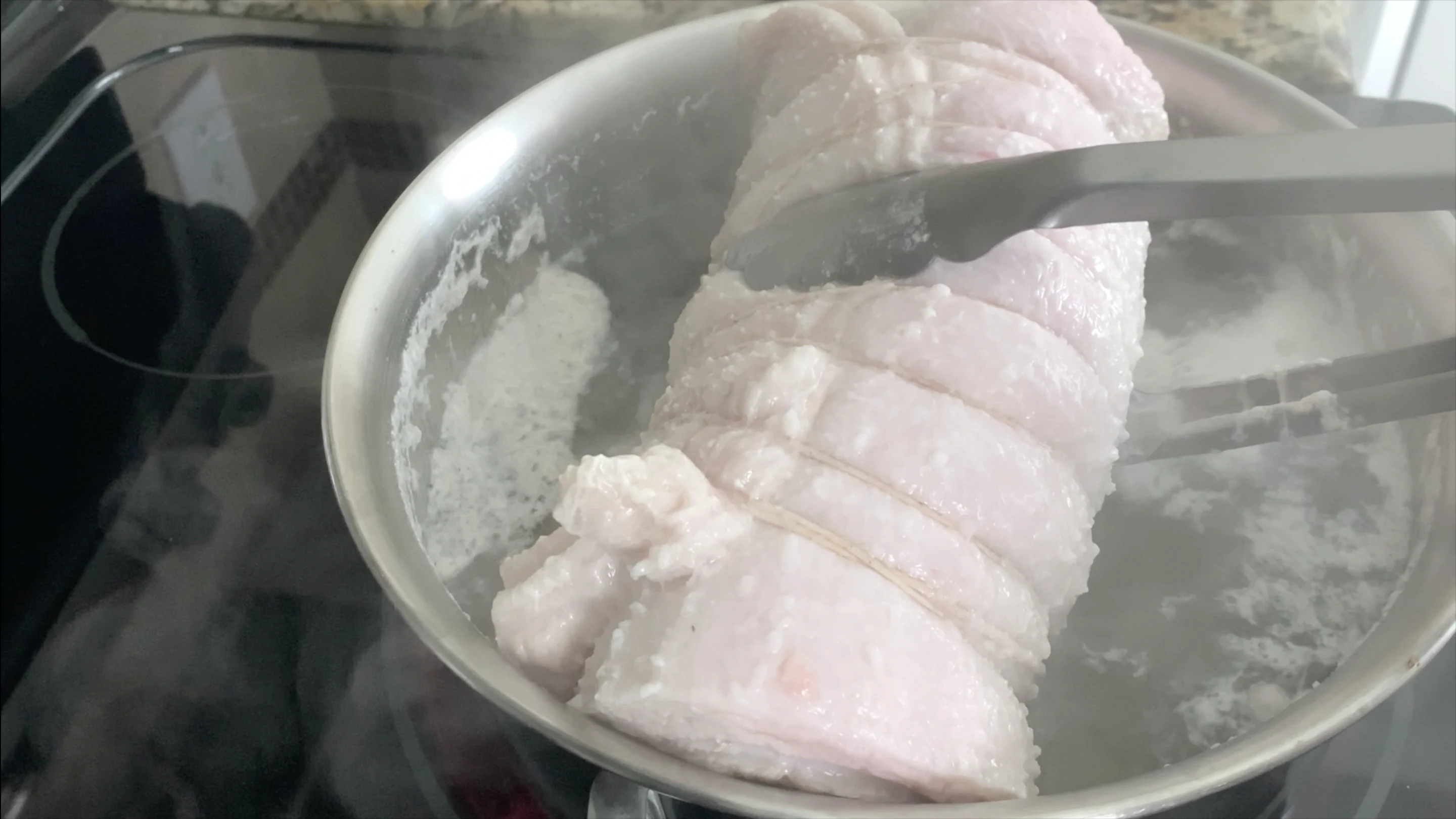 - Once boiling, remove pork from pot and rinse off with water.