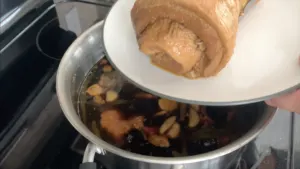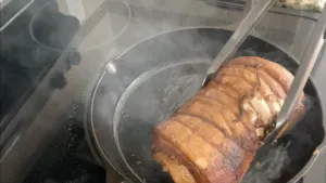 - After two hours of simmering, remove the pork from the pot let both the pork and the cooking liquids cool for 20 minutes.