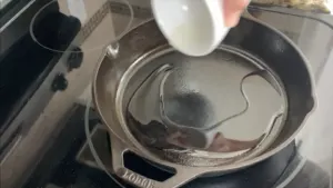 12. After the pork has cooled, heat vegetable oil on medium high heat in a cast iron skillet.