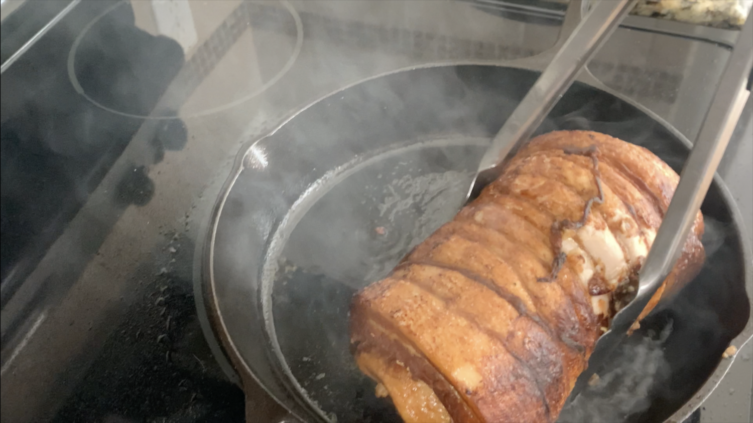 13. Once the pan is hot, sear all sides of the pork belly until the pork turns a light brown color.