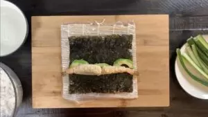 7. Roll the sushi: Use the bamboo sushi mat to fold your roll until it’s completely enclosed. Once the rice is making contact with the nori roll, pull back the sushi mat so it doesn’t get caught in the roll. Still using the sushi mat as your guide, finish rolling until it’s completely wrapped. Then wrap the sushi mat around the roll and gently tighten the roll together. Keep in mind that rolling sushi is an art that may take some practice so don’t get frustrated if it doesn’t look perfect your first time. It will get easier the more you do it.