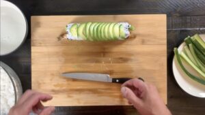 - Cut the cucumber: Cut the cucumbers into strips that are as long as your nori sheet and about 1/8 inch thick.