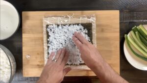 - Prepare your bamboo sushi mat: Cover your bamboo sushi mat with plastic wrap. This will help keep the rice from sticking to it.