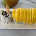 A mango roll is essentially a shrimp tempura roll with a sweet mango sauce and slices of mango draped over the top of the roll. The sweet flavor of the mango combines well with the savory shrimp tempura to make a delicious roll. I usually serve this roll with a ramekin of sweet mango sauce. However, you could also serve with unagi sauce or soy sauce.