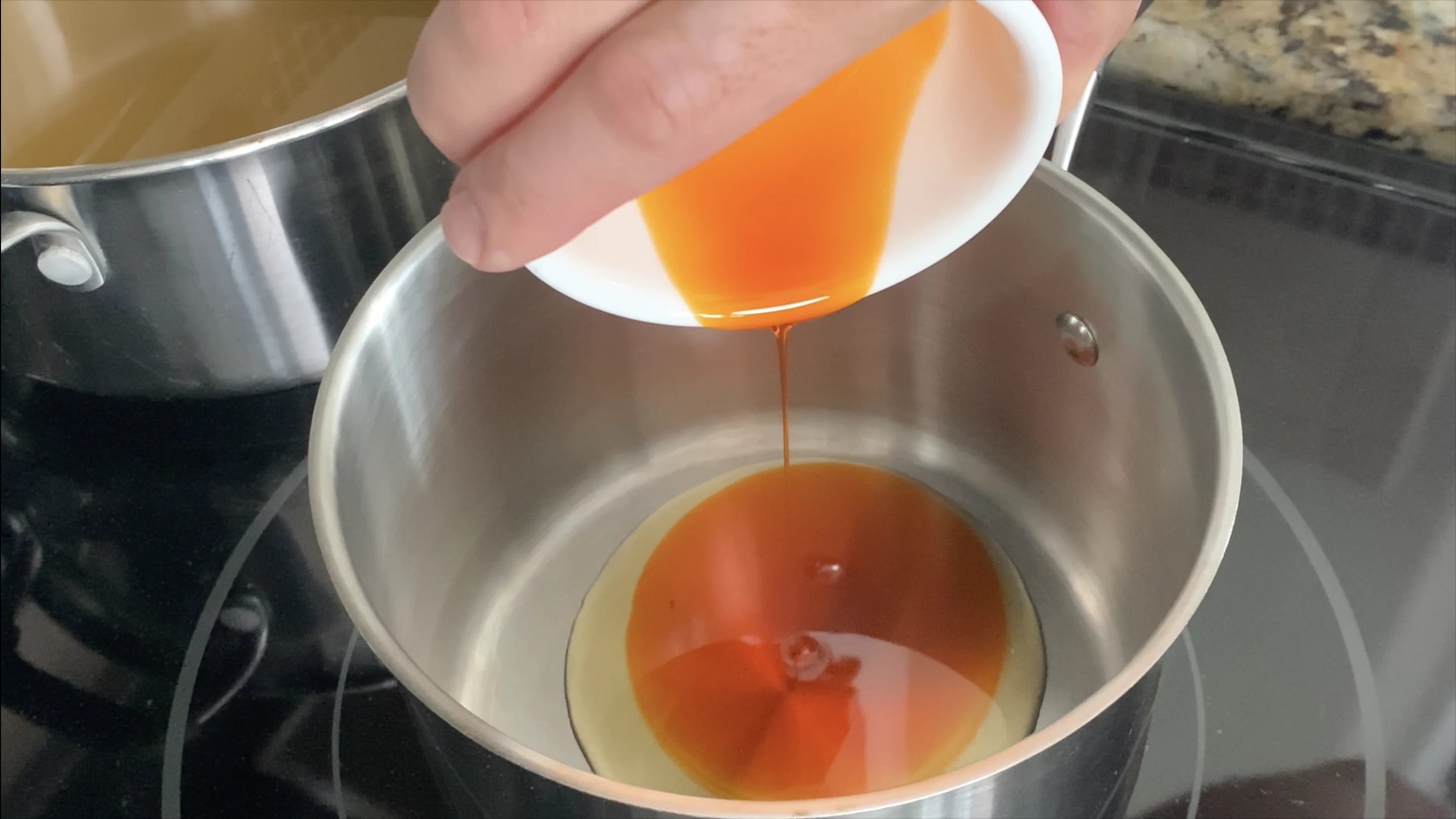 1. In a small sauce pan, heat the pork lard, sesame oil, and chili oil (la-yu) on medium-low heat until hot.