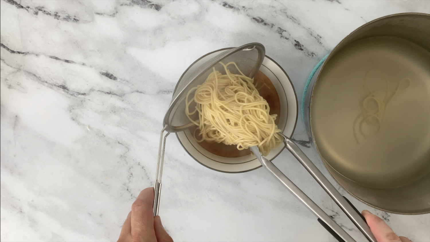 3. Once noodles are done cooking, strain thoroughly making sure to get rid of as much water from the noodles as possible. Once strained, add an individual portion of noodles to the bowl with the broth.