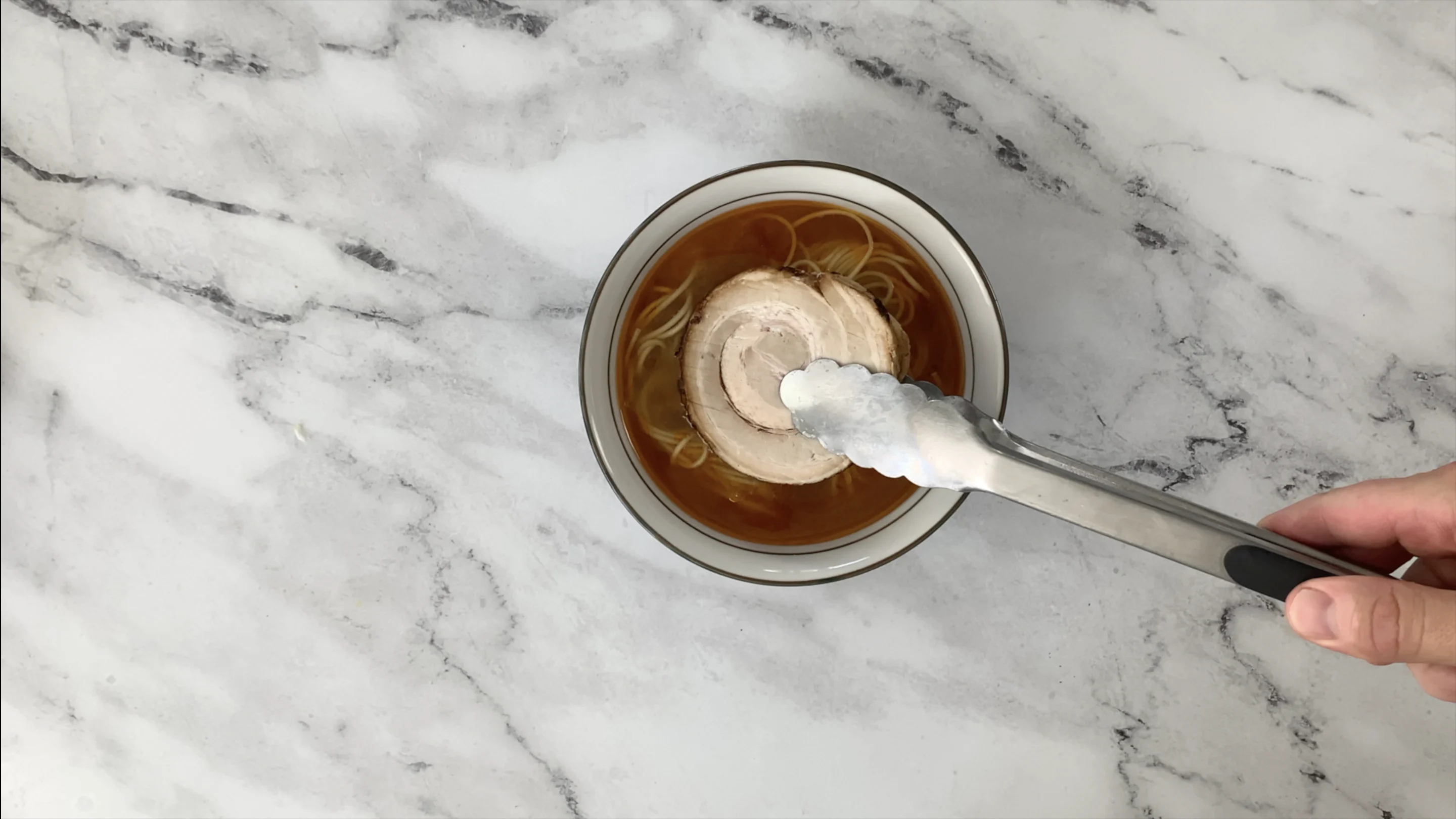 - Cut four slices about 1/4 inch thick off of the chashu pork. Heat each slice of chashu in a skillet with its cooking liquids.