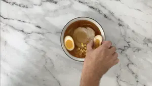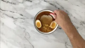 - Place each half of the ramen egg in the broth with the yolk facing up.