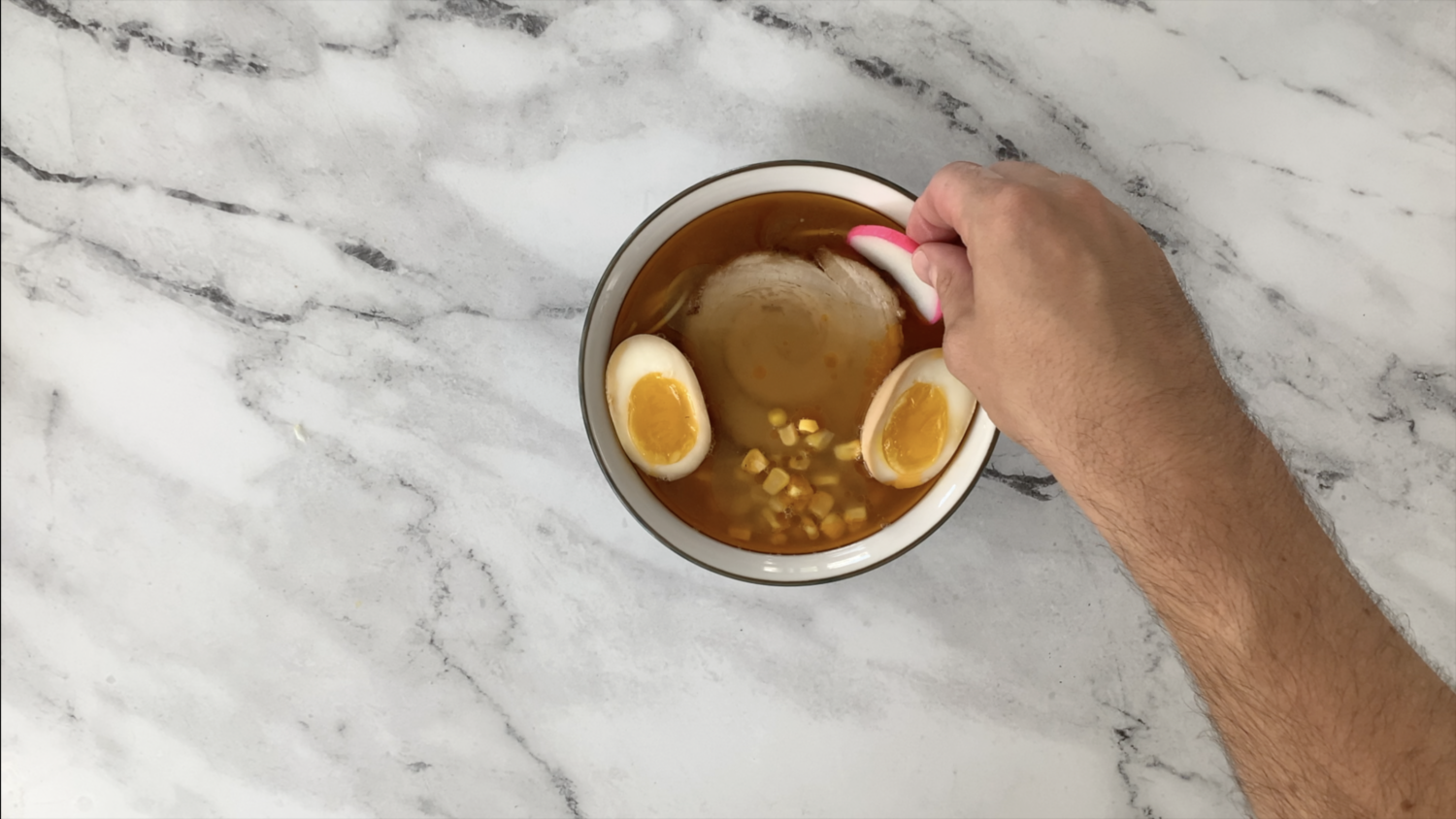 - Fold the half of the nori sheet in half and add to the bowl. Also, add a slice of narutomaki, 1/4 of the scallions, and two tablespoons of corn to the bowl.