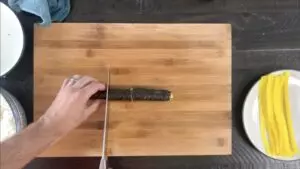 6. Cut the roll: Using a sharp knife, cut the roll into 8 pieces. I do this by first cutting the roll in half. Then cutting each half in half. Then cutting each fourth in half. Tip: Be sure to clean and wet the edge of your knife before cutting each roll.