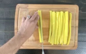 1. Cut the yellow pickled radish: Slice the yellow pickled radish into strips about 1/4 inch thick. If your radish is big enough, cut the strips so it will fit across the long half of your cut nori sheet. If it’s not big enough, cut so it will fit approximately half way across the nori sheet. That way you can fit two across.