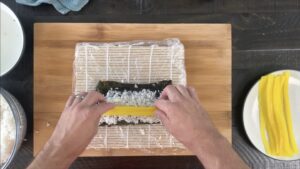 - Add the yellow pickled radish to the rice: Place the yellow pickled radish onto the rice. If your slices are long enough to fit across the entire nori sheet, I would add three slices per nori sheet. If they are shorter, double up and put six slices on the nori sheet, trying to make it the same thickness across the roll.