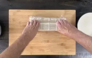 2. Prepare your bamboo sushi mat: Cover your bamboo sushi mat with plastic wrap. This will help keep the rice from sticking to it.