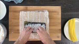 5. Roll the sushi: Wet the part of the nori sheet that does not contain rice. Starting at the side of the nori sheet with rice, use the bamboo sushi mat to fold your roll until it’s completely enclosed. Once the nori is making contact with the rice, pull back the sushi mat so it doesn’t get caught in the sushi. Still using the sushi mat as your guide, finish rolling until the roll is completely wrapped. Then wrap the sushi mat around the roll and gently press, tightening the roll together. Keep in mind that rolling sushi is an art that may take some practice so don’t get frustrated if it doesn’t look perfect your first time. It will get easier the more you do it.