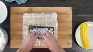 - Roll the sushi: Wet the part of the nori sheet that does not contain rice. Starting at the side of the nori sheet with rice, use the bamboo sushi mat to fold your roll until it's completely enclosed. Once the nori is making contact with the rice, pull back the sushi mat so it doesn't get caught in the sushi. Still using the sushi mat as your guide, finish rolling until the roll is completely wrapped. Then wrap the sushi mat around the roll and gently press, tightening the roll together.Keep in mind that rolling sushi is an art that may take some practice so don’t get frustrated if it doesn’t look perfect your first time. It will get easier the more you do it.If you are struggling to roll the sushi, feel free use the whole nori sheet or 3/4 of the nori sheet. This will make the roll easier to roll but the roll will be thicker.