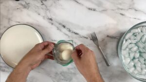 2. After the shells are removed from the eggs, add eggs to a small plastic bag. Make sure to use a bag that is just large enough to fit the eggs but not much larger. I like to form the plastic bag around a cup for this part as it makes it easier to add the marinade in the next step.