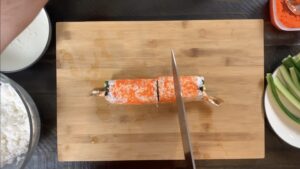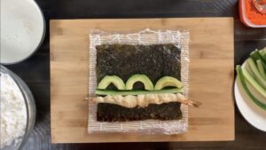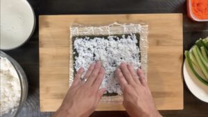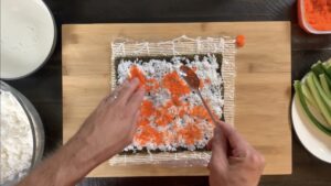 - Add tobiko or masago: After the rice is pressed onto the nori sheet, add a thin layer of tobiko or masago to the top of the rice. Then flip the sheet over so the rice is facing down.
