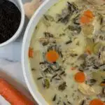 Turkey and wild rice soup consists of veggies, mushrooms, turkey, and wild rice all simmered together in a seasoned turkey broth or chicken broth with a touch of cream added before serving. The resulting dish is a savory soup that’s filling and delicious!